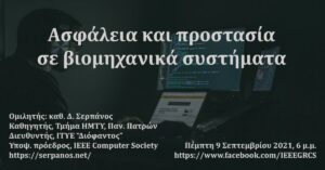 The IEEE Greece Computer Chapter invites you to the online lecture entitled “Security and Protection in Industrial Systems” which will be given by Professor Mr Dimitrio Serpano, professor at the University of Patras, Dept. of Electrical & Computer Engineering, Director at ‘ΙΤΥΕ ΔΙΟΦΑΝΤΟΣ’ and Candidate for IEEE Computer Society Chair on Thursday, 9 September 2021, at 6 pm at https://www.facebook.com/IEEEGRCS.